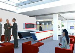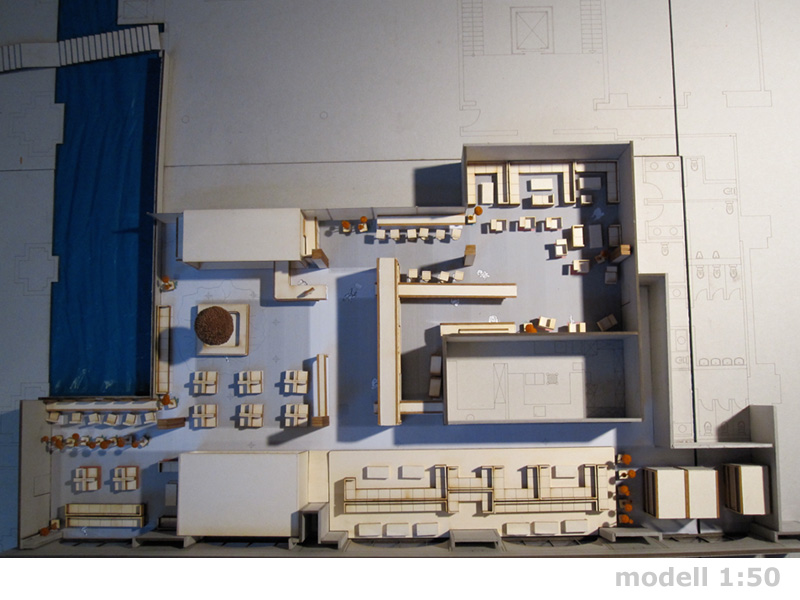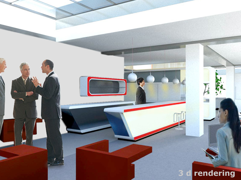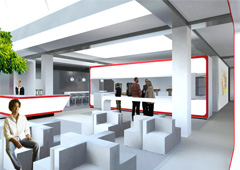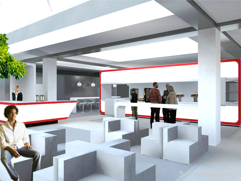Das neue Lounge Konzept beruht auf einer Kombination aus dem DB-Logo und den Zugformen. Adaptiert man diese in die dritte Perspektive entstehen begehbare Cubes und Möbel. Es ist ein Spiel von Durchdringung und Zusammenfügen.
