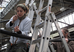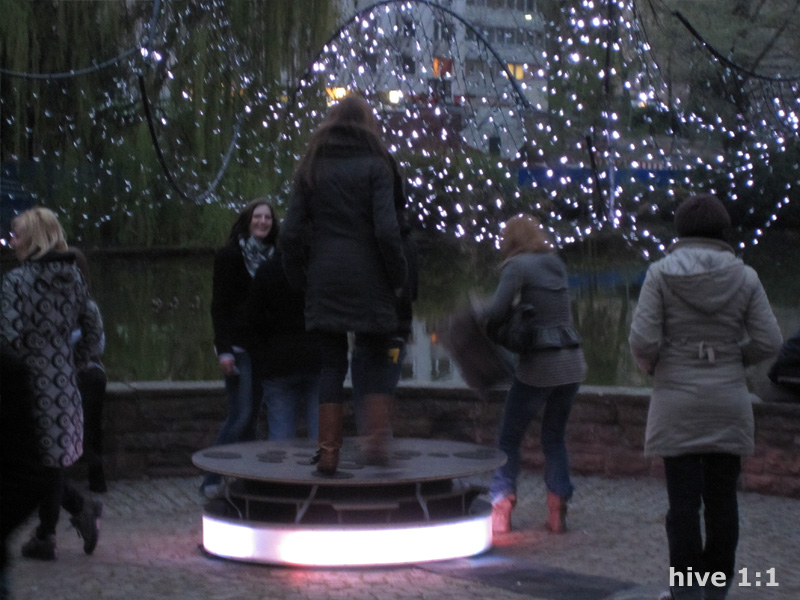 Über ein Interaktionsfeld konnten die Besucher mit „hive“ interagieren. Im Ruhezustand reagierte das bewegte Licht auf eigene Impulse im Verhalten und veränderte so das Aussehen des Lichtschwarms. Im aktiven Zustand nahm der Betrachter auf der Plattform durch seine Bewegungen Einfluss auf die Animation der Lichtpunkte und konnte so die Rolle des Jägers oder der Beute einnehmen – den Schwarm anlocken oder vertreiben. Die Lichtinstallation wurde durch die farbliche und akustische Bespielung der videofähigen LED-Leuchten zum Leben erweckt. Die LED-Leuchten wurden einzeln angesteuert und als auf sich selbst reagierendes System animiert.