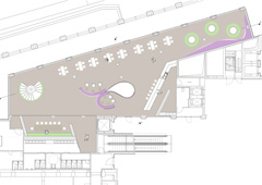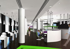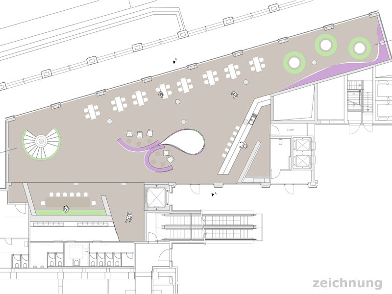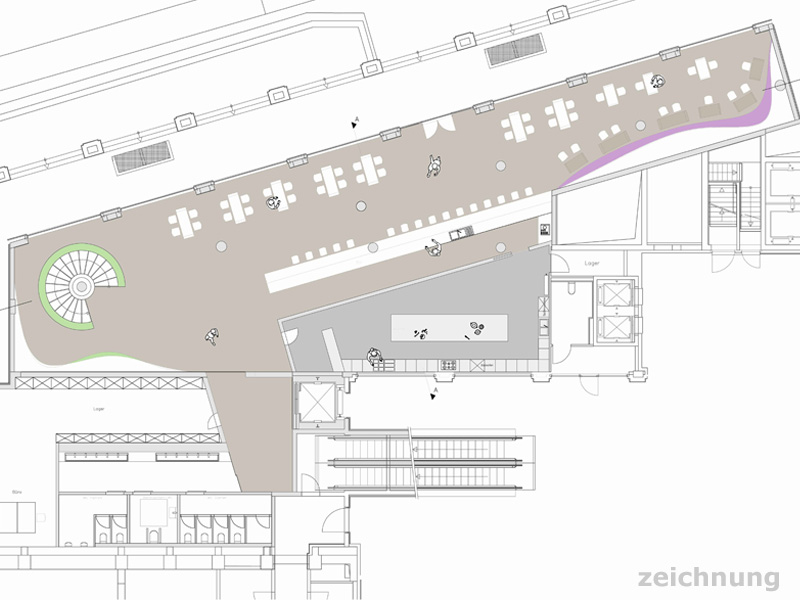 Die Spielebar „PikAss“ ist eine Kombination aus Café, sRestaurant und Verkaufsfläche für Gesellschaftsspiele. Hierbei ist uns wichtig, dass es keine räumliche Trennung zwischen den beiden Nutzungen gibt. So ist die Ausstellungsfläche für die Gesellschaftsspiele in den beiden Geschossen des „PikAss“ in die Innenarchitektur integriert. Zum Einen dient es als raumtrennende Skulptur, zum Anderen als Abrundung und Kunstobjekt der Wände.